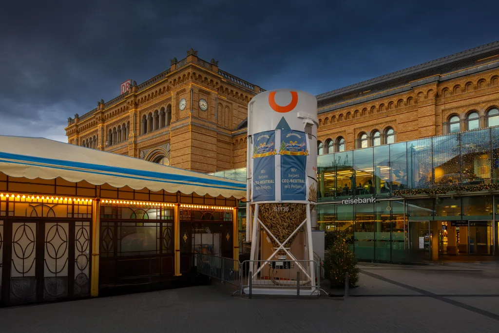 14 mobile Pellet-Heizungen wärmten mit modulierender Technik die gigantische Gebäudefläche von rund 17 Fussballfeldern.